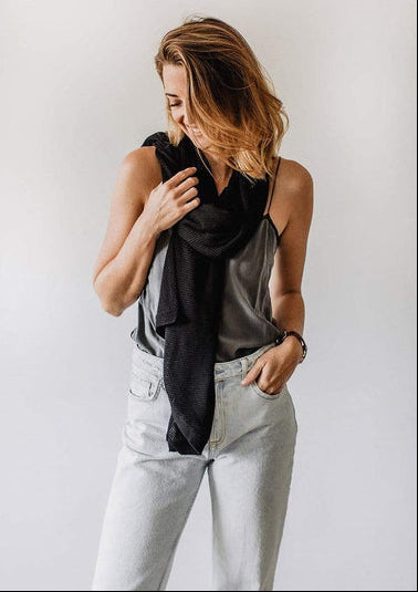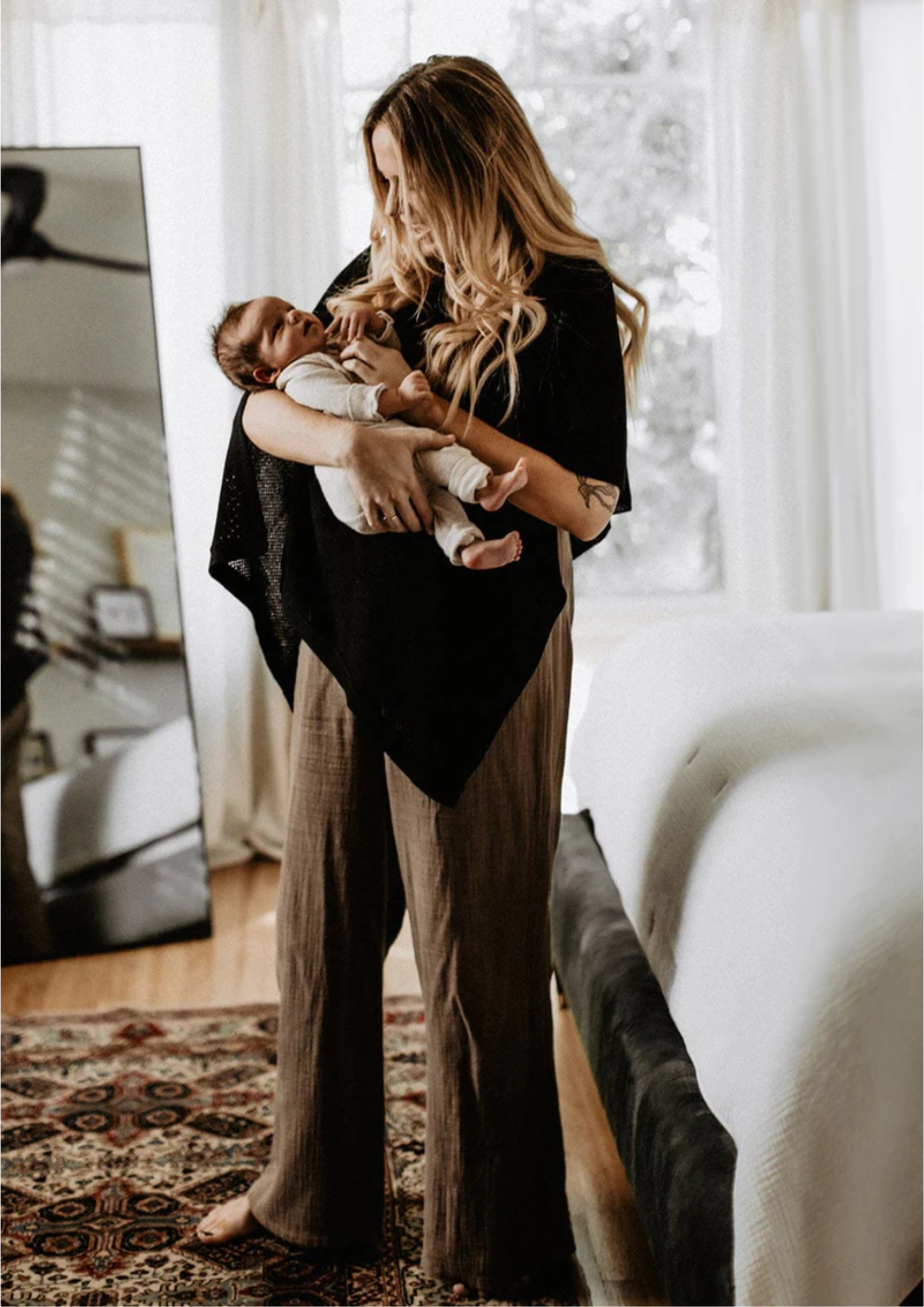 Le tissu est fluide, léger et thermorégulant, ce qui permet de garder une température agréable — ni trop chaud, ni trop froid — aussi bien pour maman que pour bébé.