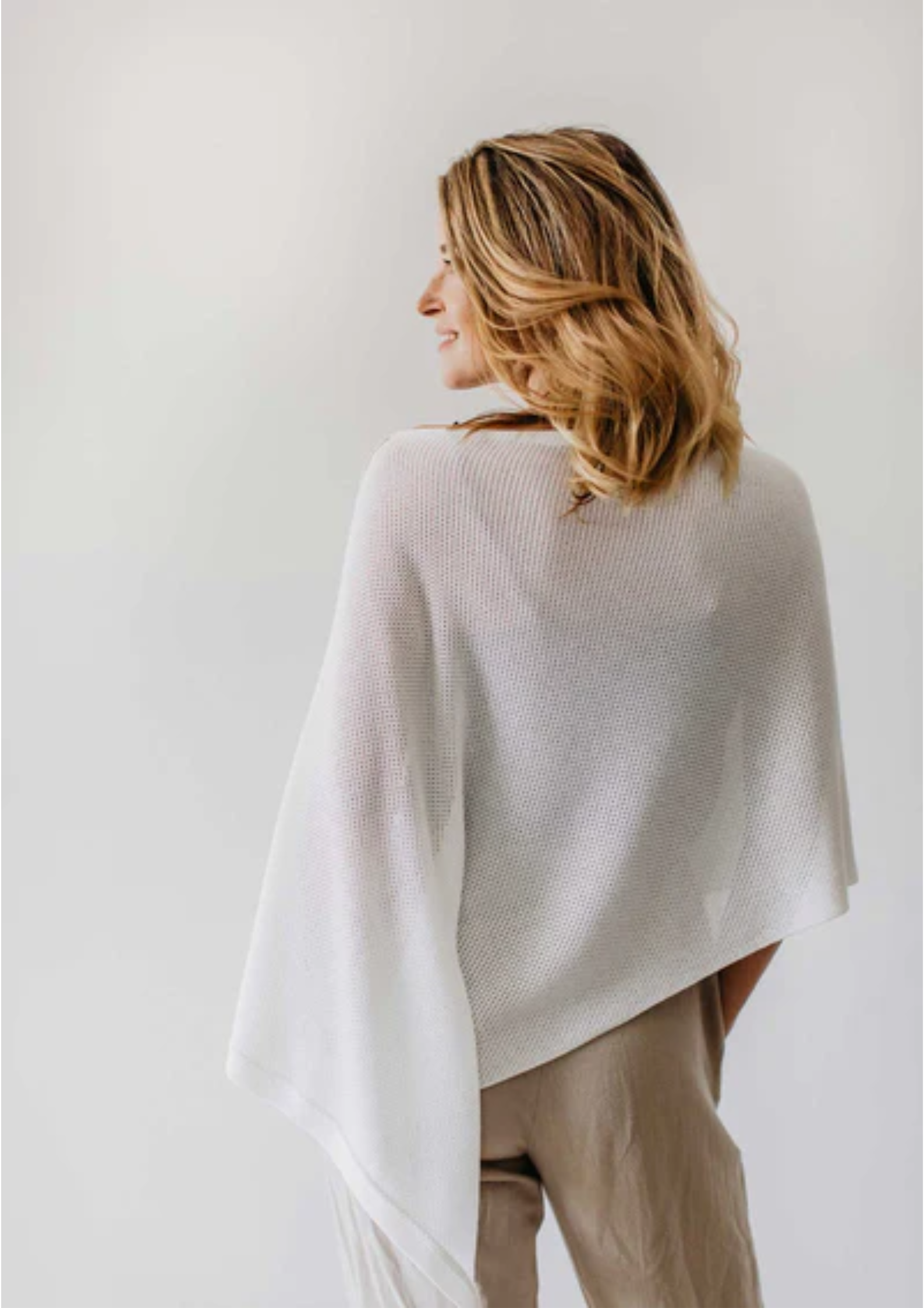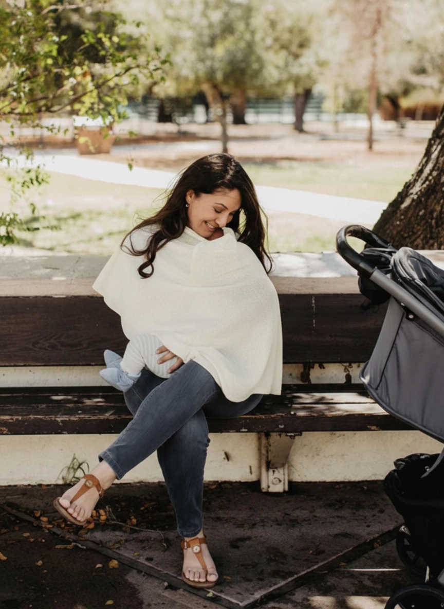 La cape SERENITY permet d’allaiter partout, en toute discrétion, sans gêner bébé. Elle couvre le buste et le dos, limite les regards, coupe du vent et du soleil léger, et laisse les mains libres. Elle peut aussi servir de petit châle ou de couverture légère.